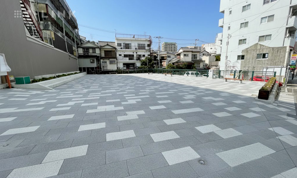 Explanation架け替え工事をする際の平板舗装。遠江黒(とおとうみ)の骨材を使用。表面を研磨し200×200のサイズを採用。